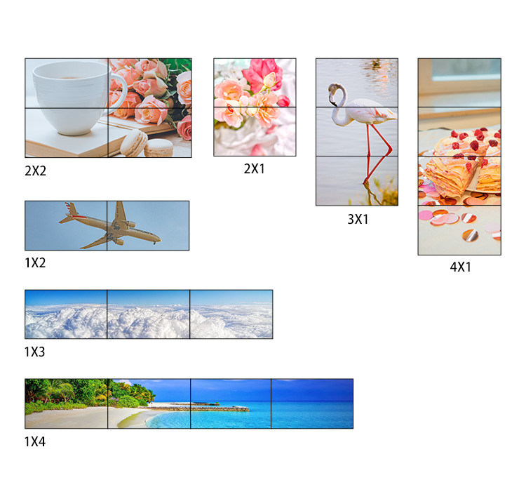 2. Supporta più modalità di video wall come 1x1, 1x2, 1x3, 1x4, 2x1, 2x2, 3x1, 4x1.