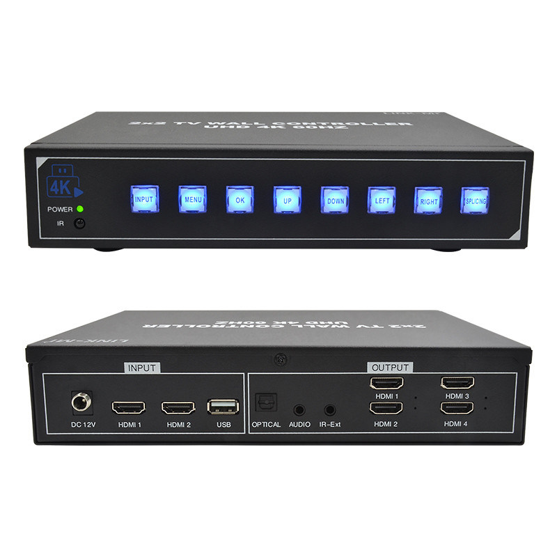 LINK-MI LM-TV04U2x2 Video Wall Controller è utilizzato per 4 Ultra HD Splicing TV. Supporta una risoluzione massima di ingresso fino a 4K @ 60Hz. Può riprodurre video e immagini su USB 2.0, e anche musica e testi.